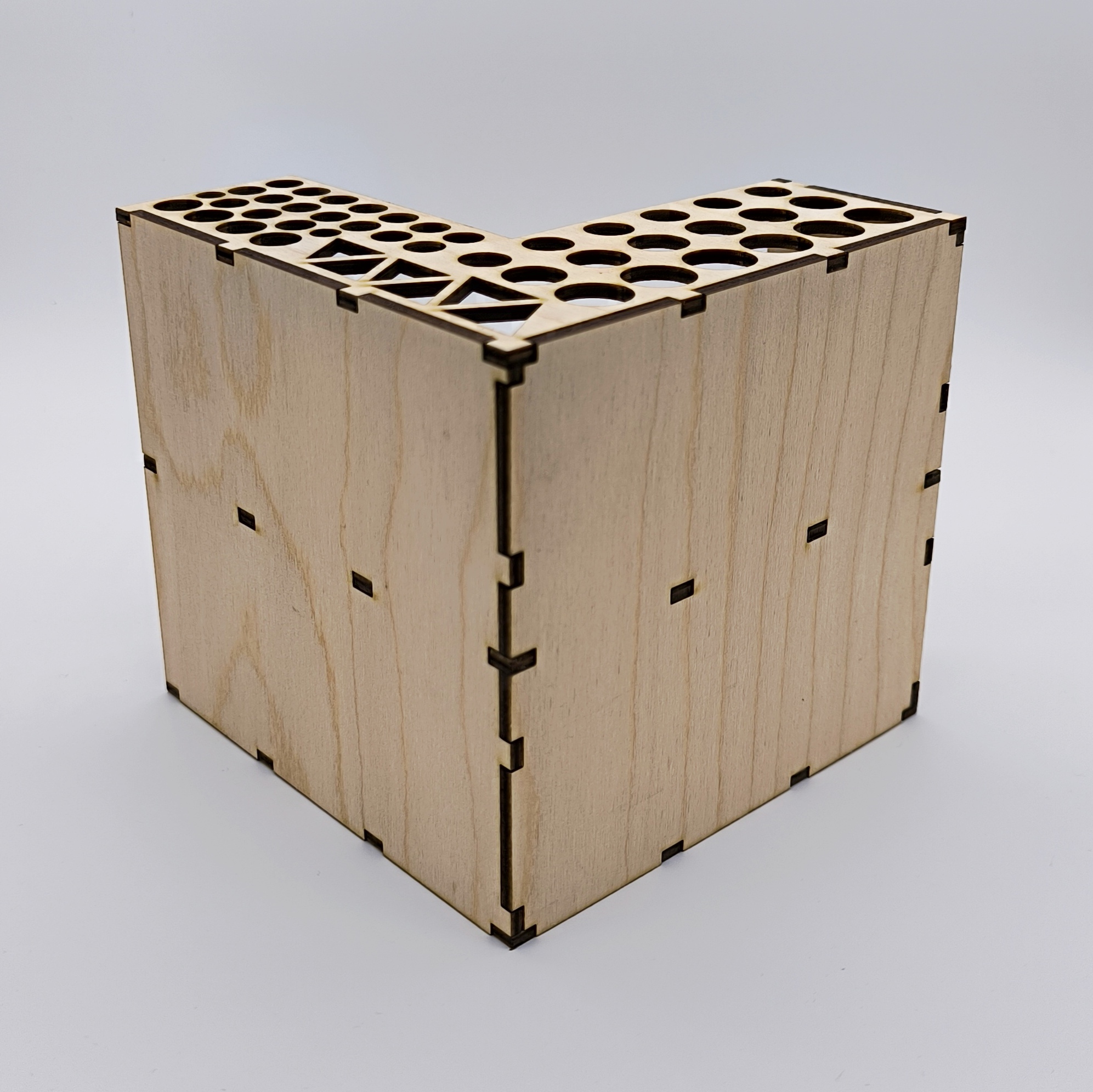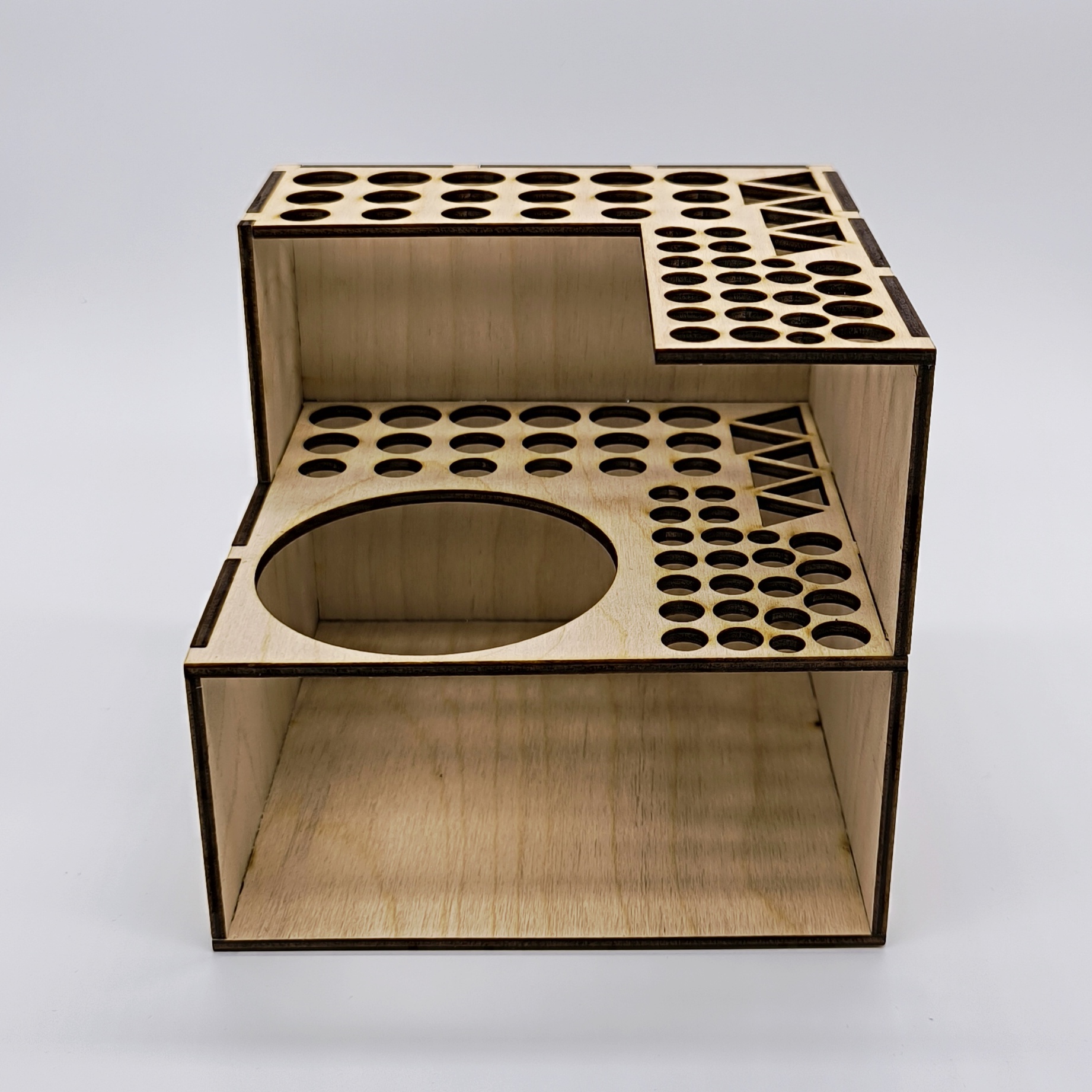 Stojak został zaprojektowany z myślą o przechowywaniu pędzli i innych przyborów, posiada otwory okrągłe o średnicy od 6 mm do 14 mm oraz trójkątne o bokach 15 mm oraz 18 mm. Stojak posiada również otwór umożliwiający umieszczenie kubka / pojemniczka do np. płukania pędzli, zapewniający stabilność.